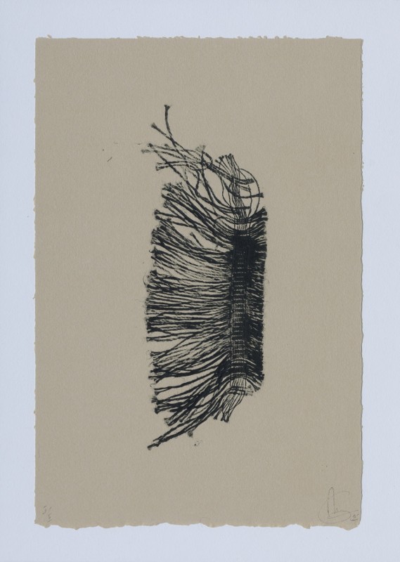Estampe d'un fragment de lisière en lin des tissus de Toiles de Mayenne, enduite d'encre et passée sous presse sur un papier Velin d'Arches vert de320g