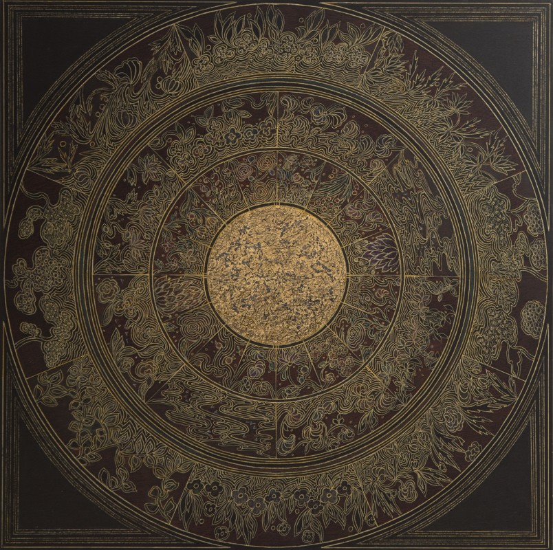 Pastel, encre et feuille d'or sur papier marouflé sur bois